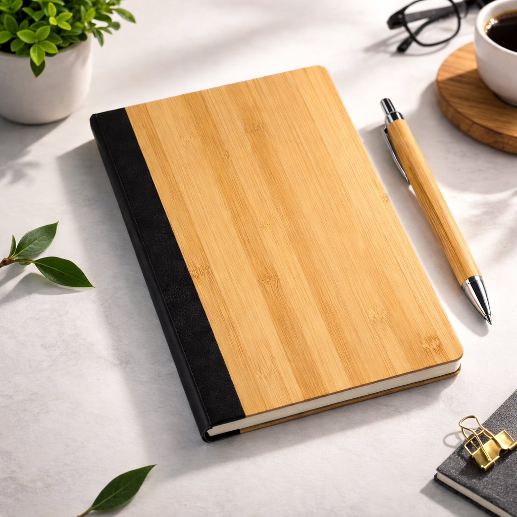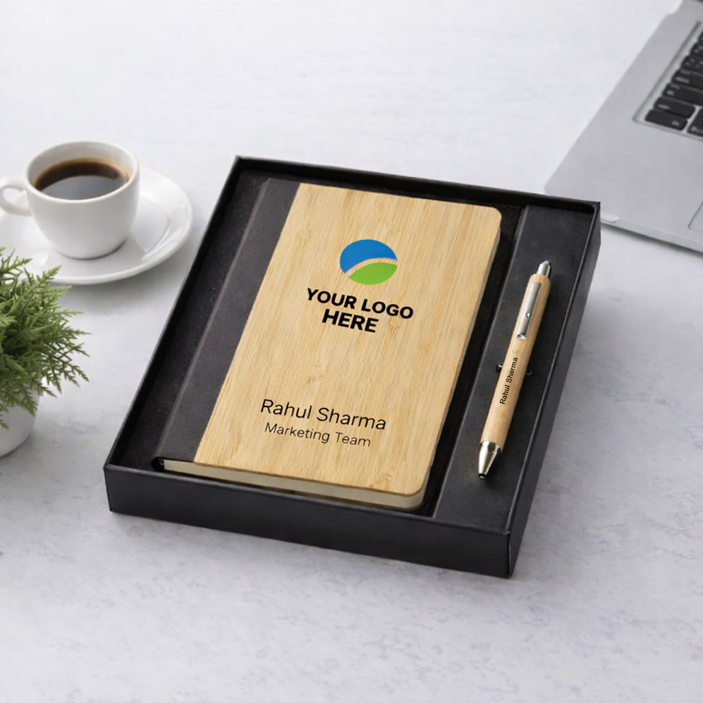 Eco-friendly bamboo diary and pen set designed for sustainable corporate gifting and employee welcome kits. The diary can be customized with your company logo and name, while the pen can be personalized with individual employee names — creating a thoughtful and practical branded gift for modern workspaces.